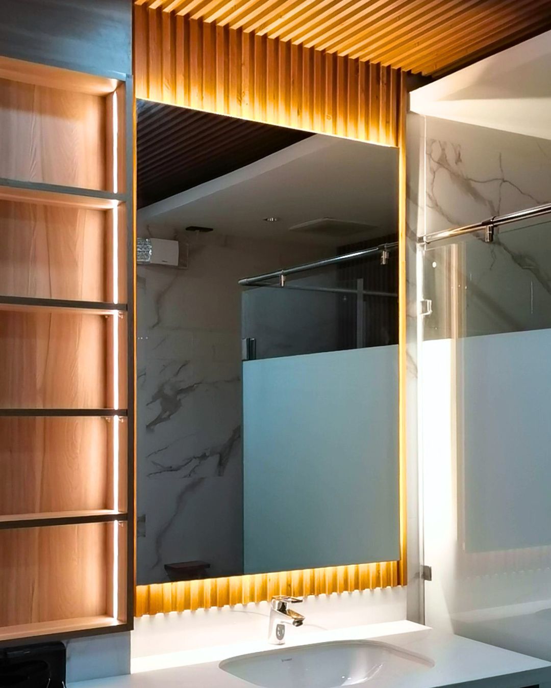 Fluted glass adds a touch of elegance and privacy with its vertical textured design, while still allowing natural light to pass through.